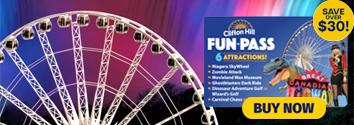 Six attractions, one low price! Save $30 off individual attractions and conveniently order online. The Clifton Hill Fun Pass includes admission to the Niagara SkyWheel, Creepy Castle, Movieland Wax Museum, Dinosaur Golf or Wizards Golf, Ghost Blasters, Toy Store 4D Ride or Carnival Chaos Ride. Fun Pass admissions can be used anytime within one year of purchase.